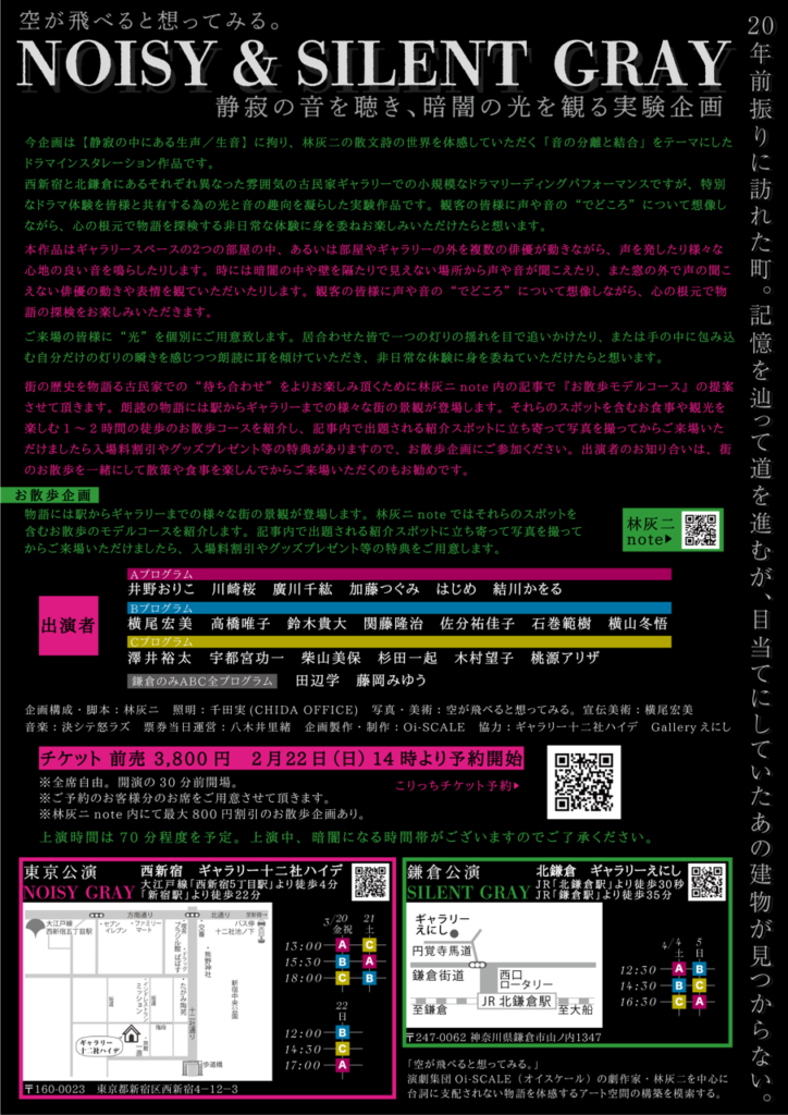 今企画は【静寂の中にある生声/生音】に拘り、Oi-SCALE林灰二の散文詩の世界を体感していただく